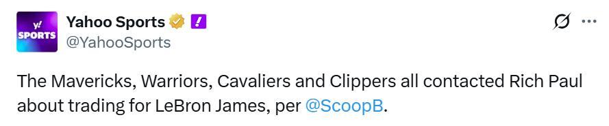 根据NBA记者ScoopB最新报道,勇士、独行侠、骑士和快船四支球队已经联系詹姆斯经纪人里奇保罗,询问勒布朗交易相关事宜。