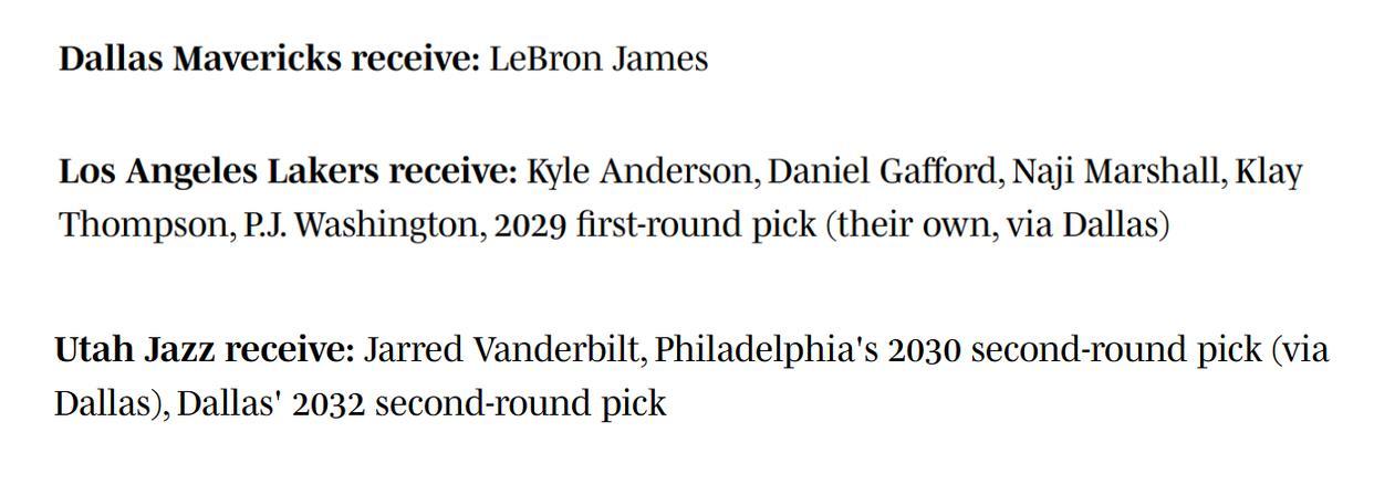 湖人得到:李凯尔+加福德+马绍尔+克莱+PJ华盛顿+29年首轮签(湖人自己的,来自独行侠);