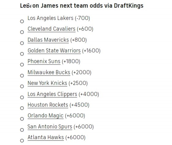 7月12日讯 近日美媒Draftkings晒出詹姆斯最新下家赔率,湖人第一,骑士排第二,独行侠位列第三,勇士第四。